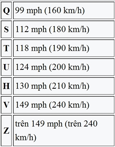 - Tốc độ tối đa của lốp có thể tra trong bảng: